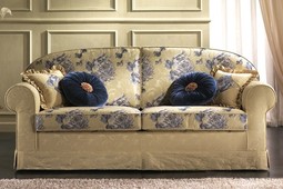 Небольшой и аккуратный диван в классическом стиле. Каркас выполнен из массива дерева, ножки прикрывает декоративная бахрома.