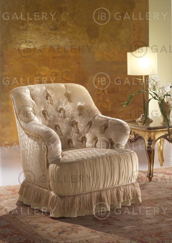 Кресло на скрытом каркасе. Спинка украшена стежкой капитоне, а основание - юбочкой, которая скрывает ножки.