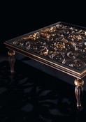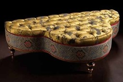 Каркас из дерева, обивка из кожи или текстиля. По периметру модель украшена декоративными бусинами.