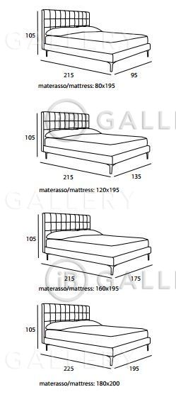 Высокое изголовье выполнено в виде двух подушек, украшенных стежкой. Каркас из дерева, ножки металлические, хромированные.