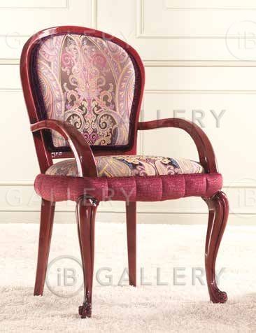 Каркас модели из массива дерева, модель оснащена жесткими подлокотниками. Спинка и сиденье в обивке из кожи или текстиля, ассортимент по каталогу фабрики.