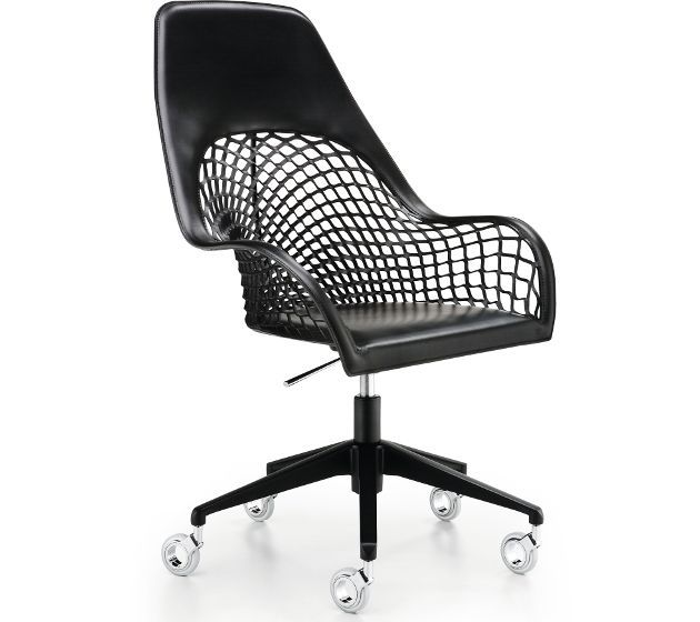 Стильное кресло на колесиках в кожаной обивке. Ассортимент отделок по каталогу фабрики. Кресло оснащено механизмом регулировки высоты.