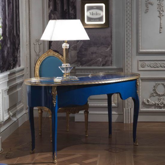 Небольшой письменный стол для классического интерьера. Столешница изогнутая, каркас украшен декоративной резьбой.