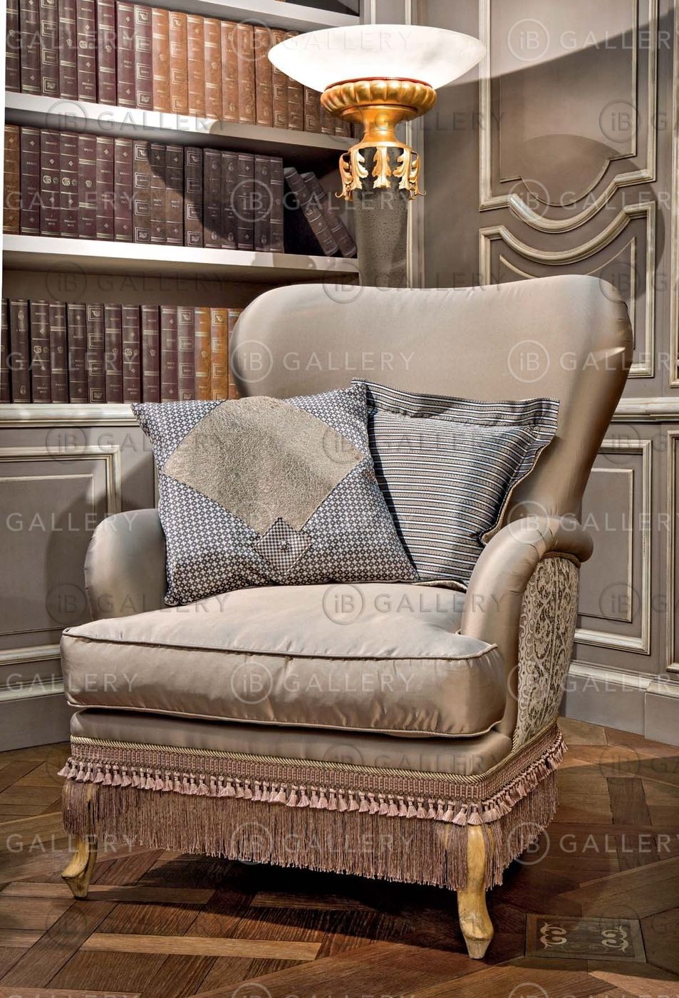 Комфортное кресло в обивке из текстиля или кожи. Опирается на резные ножки. Основание кресло украшено бахромой.