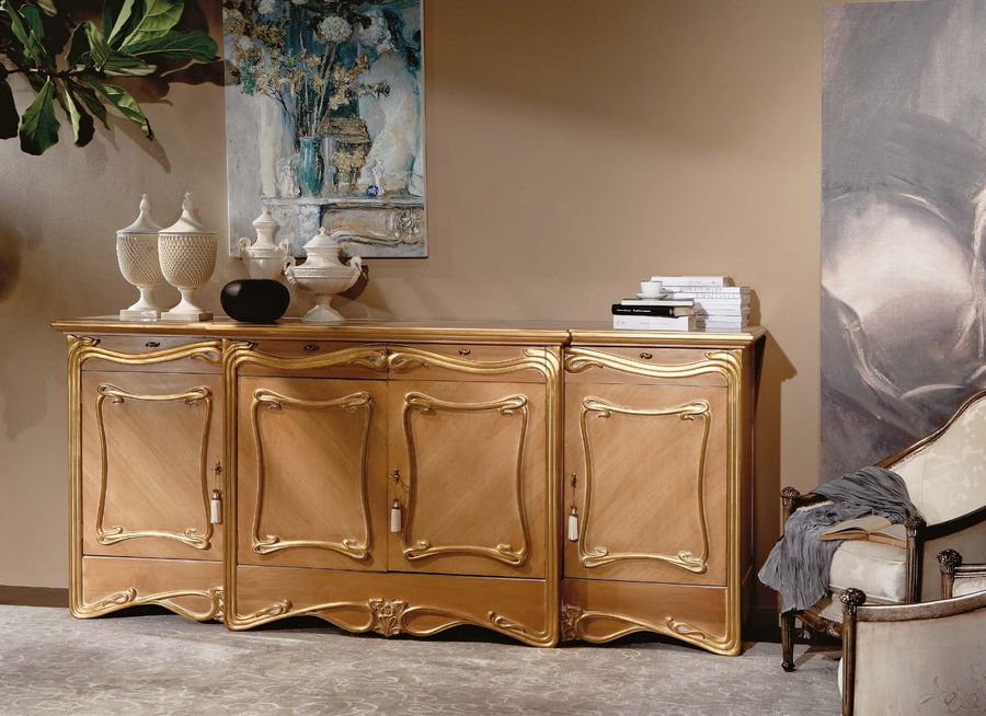 Буфет в классическом стиле на деревянном каркасе с резными элементами. Оснащен четырьмя выдвижными ящиками и четырьмя распашными дверцами с замочками.