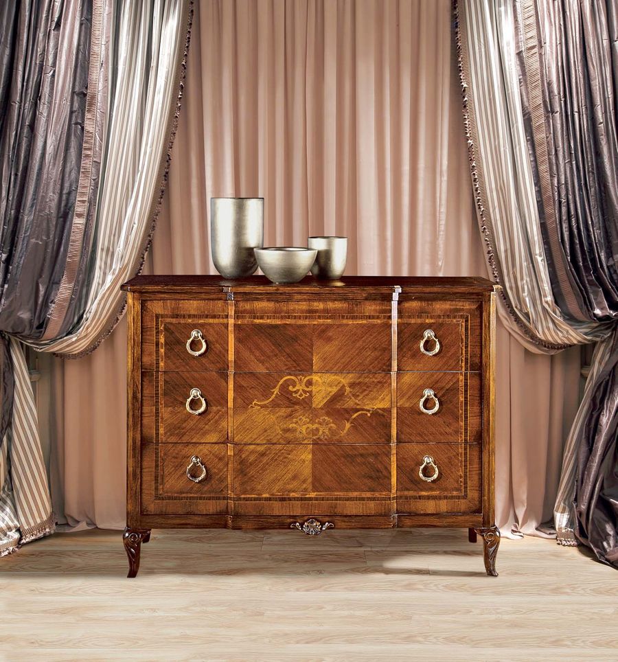 Деревянный комод в классическом стиле с тремя выдвижными ящиками. Три варианта отделки для каркаса. Ручки круглые, металлические.