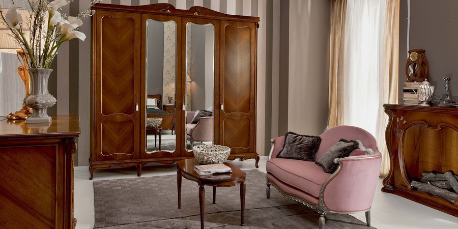 Вместительный платяной шкаф в классическом стиле. Оборудован четырьмя распашными дверцами. Центральные дверцы с зеркалами в полную высоту.