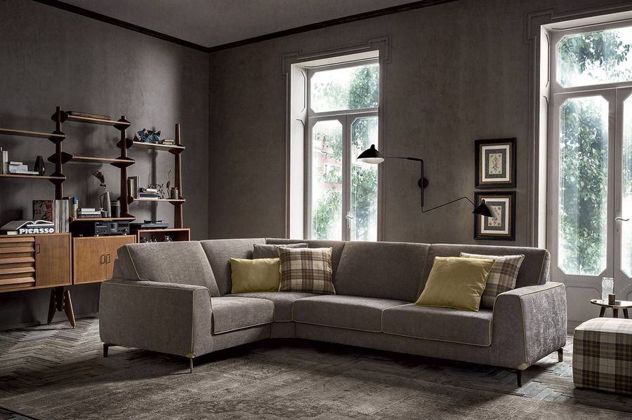 Стильный диван на металлических ножках. Подушки мягкие, сиденье глубокое. Обивка выполнена из текстиля, выбор по каталогу фабрики.