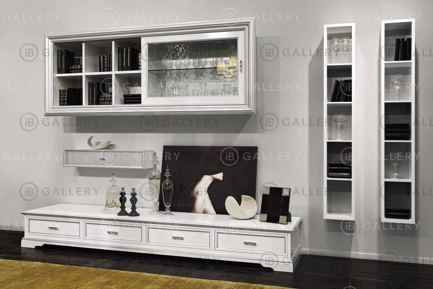 Состоит из двух открытых полок, двух навесных шкафчиков и низкой тумбы с выдвижными ящиками.