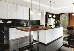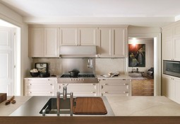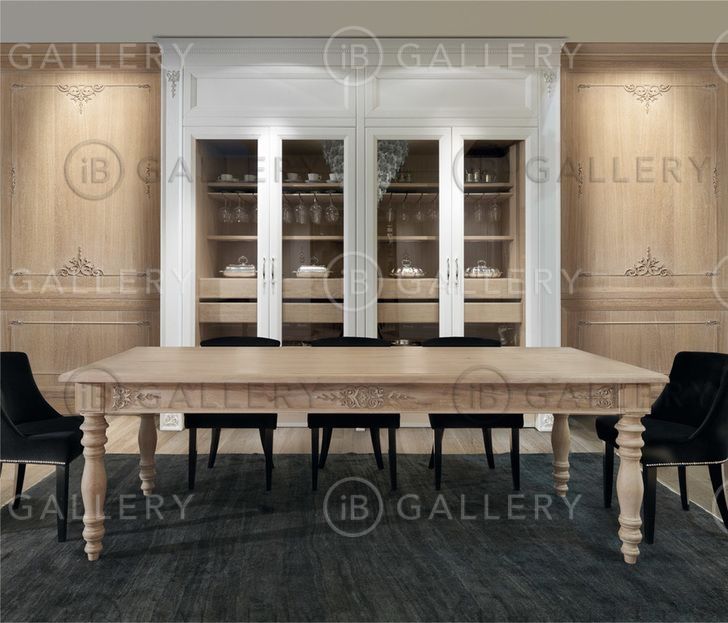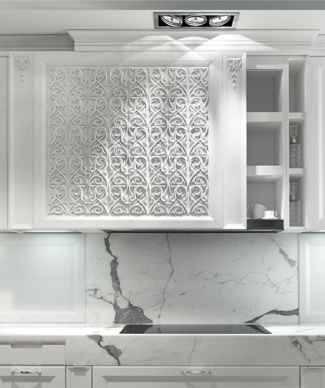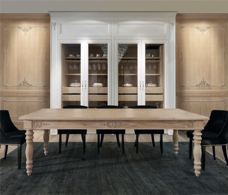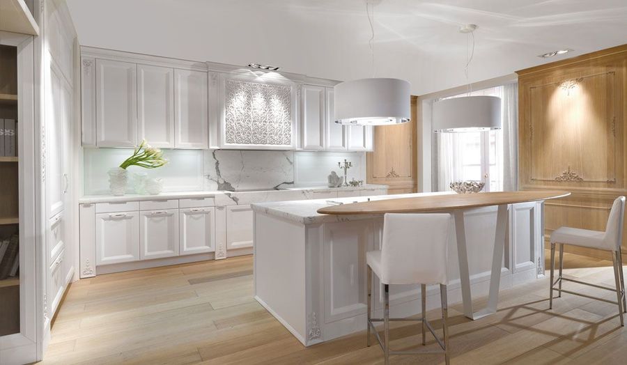 Дизайнеров вдохновила роскошная лепнина дворцов в стиле барокко, что отражается в деревянных дверцах и в декоре. Классический стиль изыскано перетекает в современный, именно на балансе прошлого и будущего была создана данная кухня.