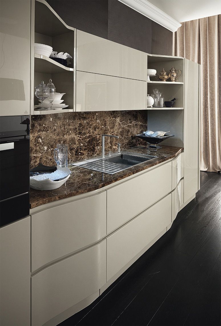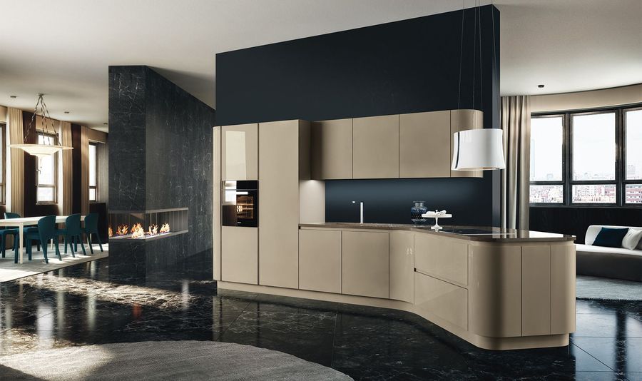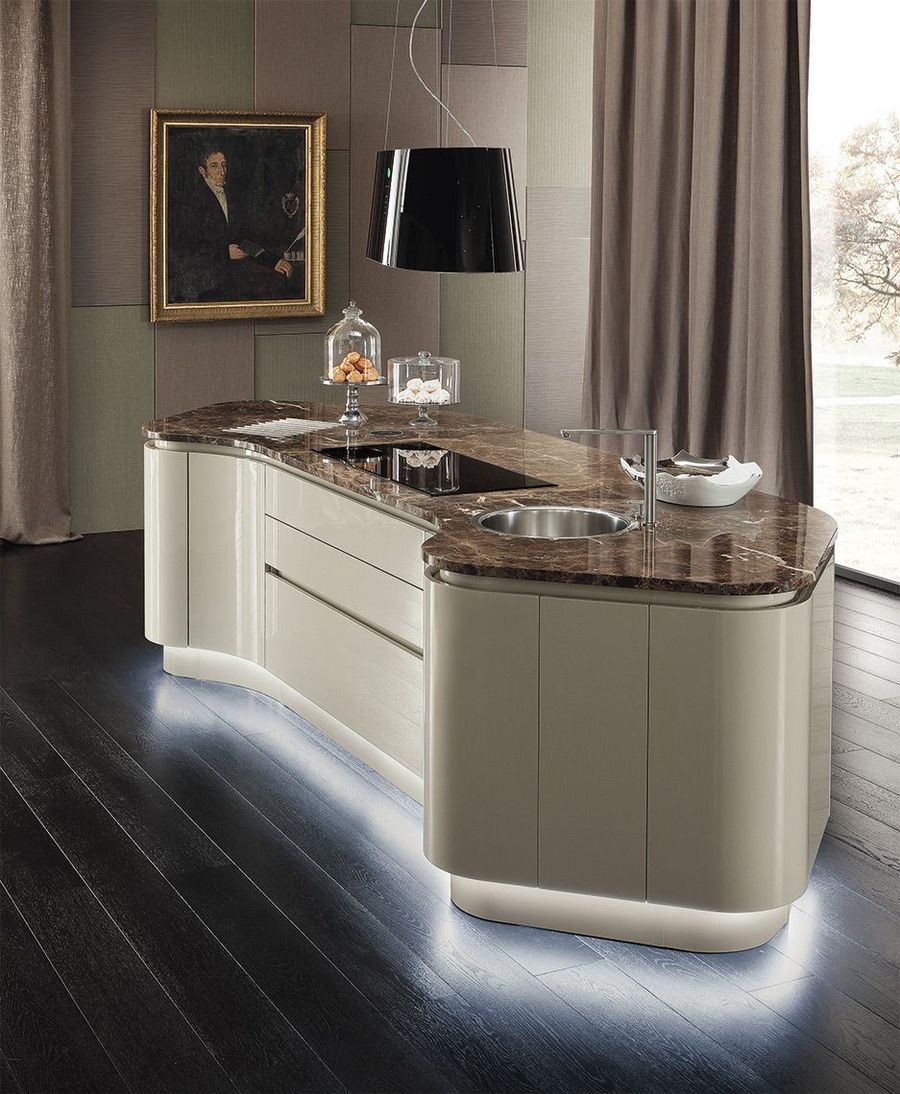 Отличительной чертой проекта является остров, который становится важным акцентом кухни, благодаря своей нестандартной обтекаемой форме. Проект использует пространство по максимуму, не перенасыщая комнату, но и не уменьшая ее функциональности. Кухня имеет широкий выбор цветовой гаммы в приглушенных тонах.
