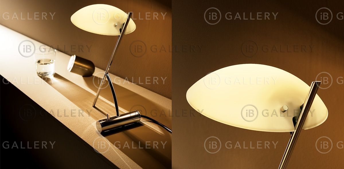 Настольная лампа с плафоном в форме перевернутого лепестка, на хромированном основании λ-образной формы.
