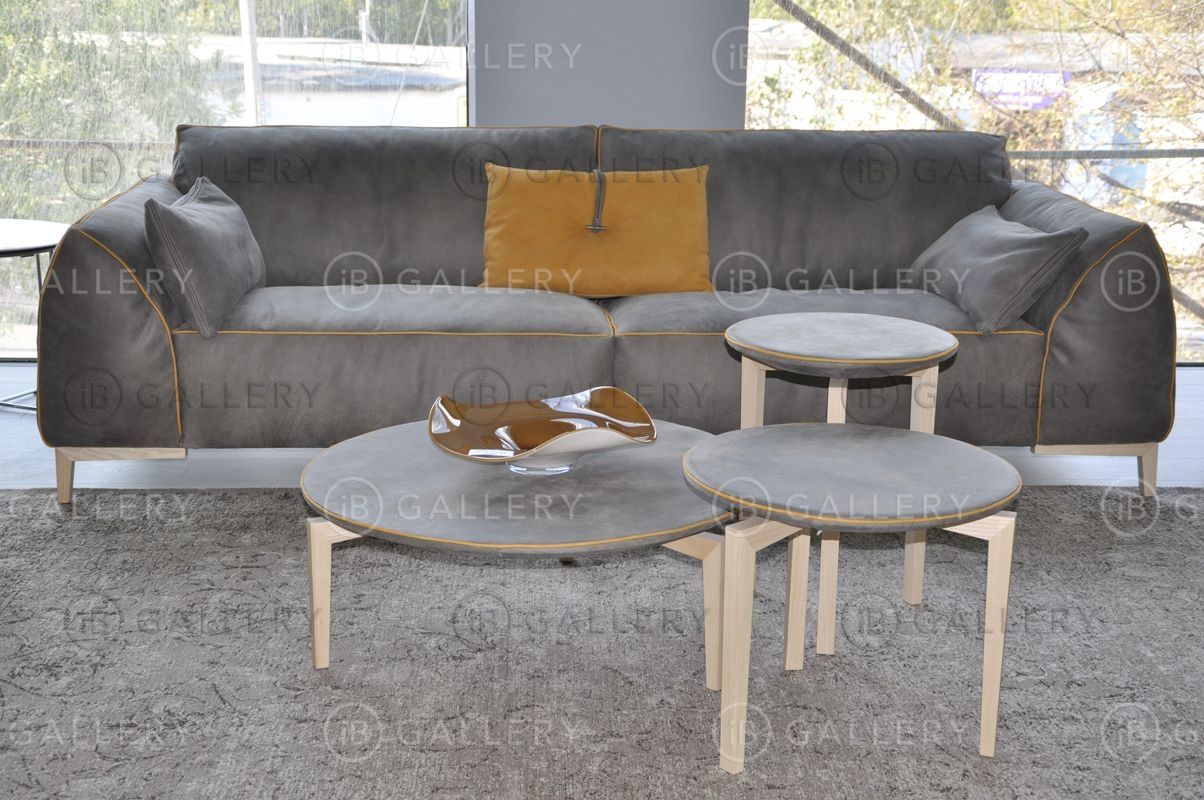 Столешница столика сделана из кожи, кант из ткани. Отделка деревянных ножек: Noce canaletto e Frassino. Представлен в 3-х размерах.