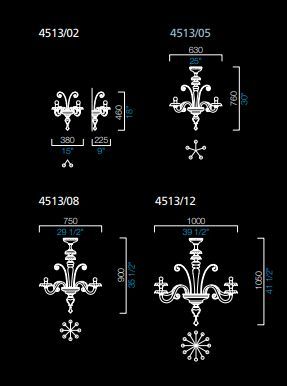 Представлена с 5, 8 или 12 лампочками. Металлическая отделка позолочена для золотой люстры, полированный хром для всех остальных цветов.