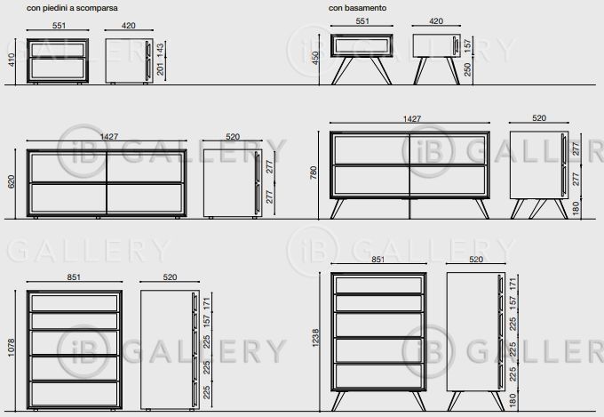 Отделка представлена в лакировке. Элементы сделаны из состаренного дуба. Пазы между ящиками используются в качестве ручек. В наличии модели на ножках и без них.
