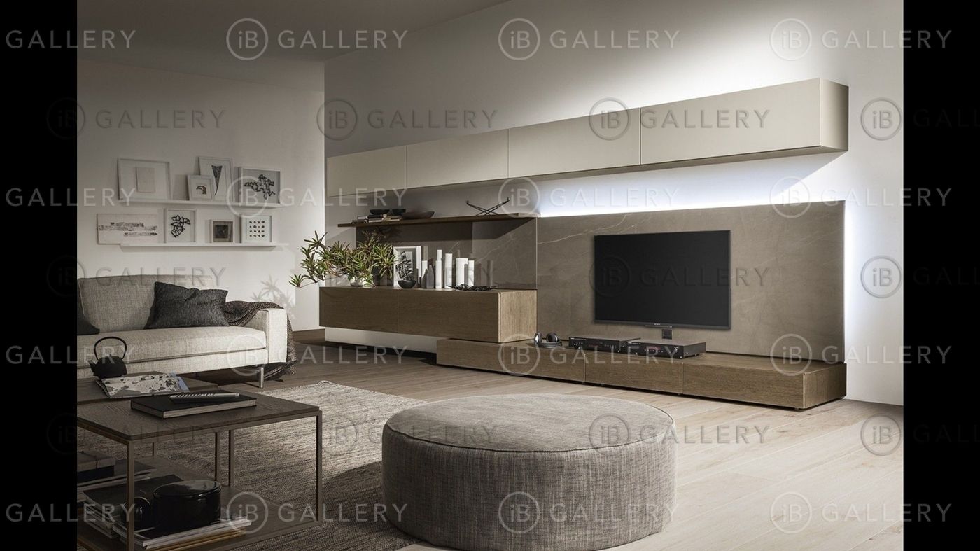 - Стильная композиция с задней панелью, полкой, тумбой для ТВ и буфетом