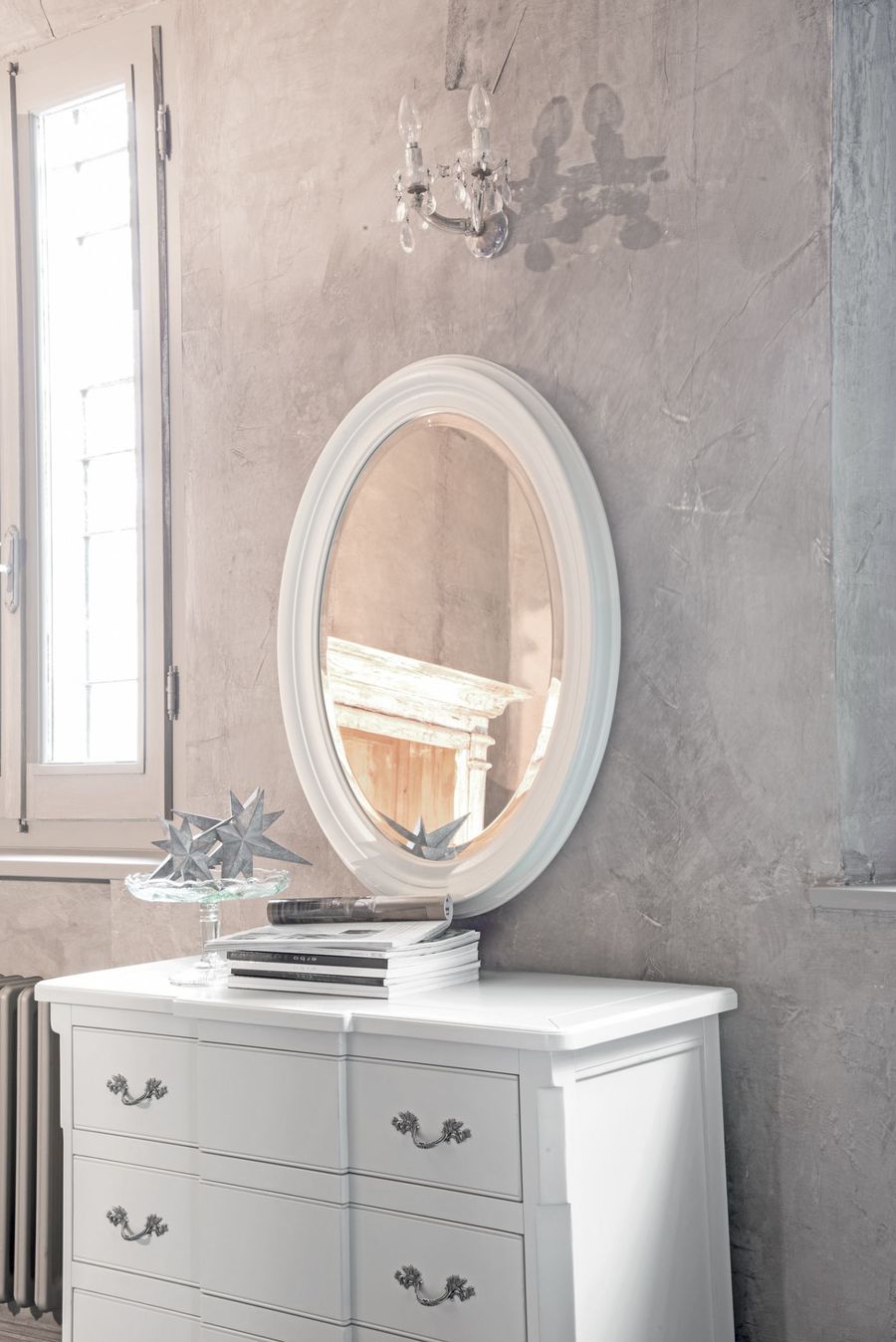 Зеркало выполнено с овальной оправой, которая представлена в деревянном или лакированном варианте.