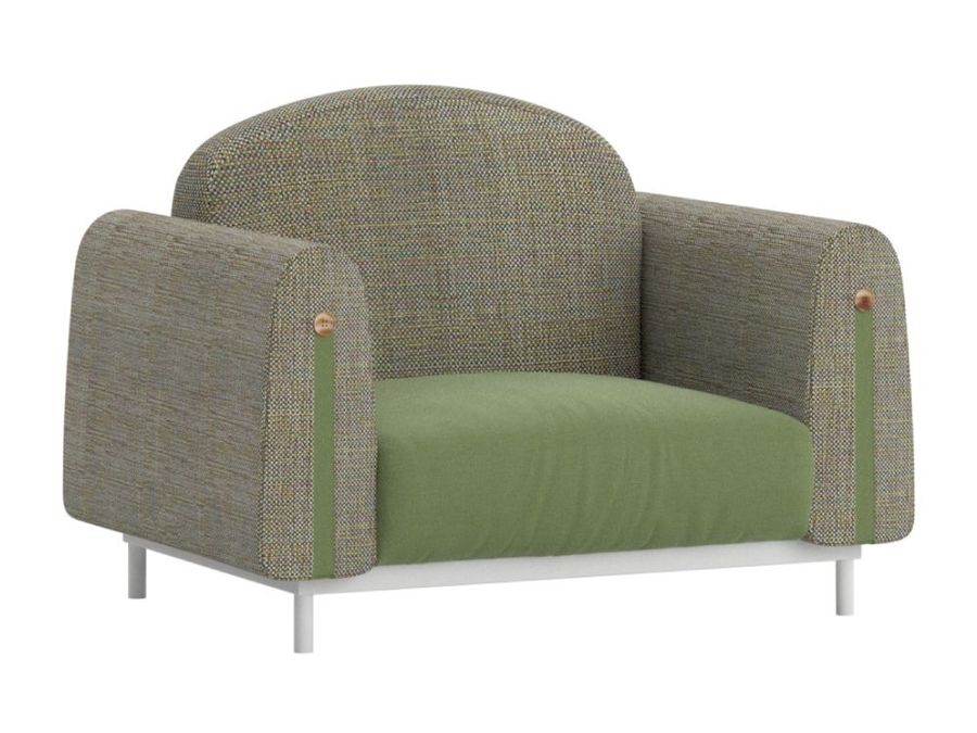 Кресло пригодно для использования на улице. Основание сделано из алюминия. Кресло покрыто тканью, представленной в нескольких цветах.