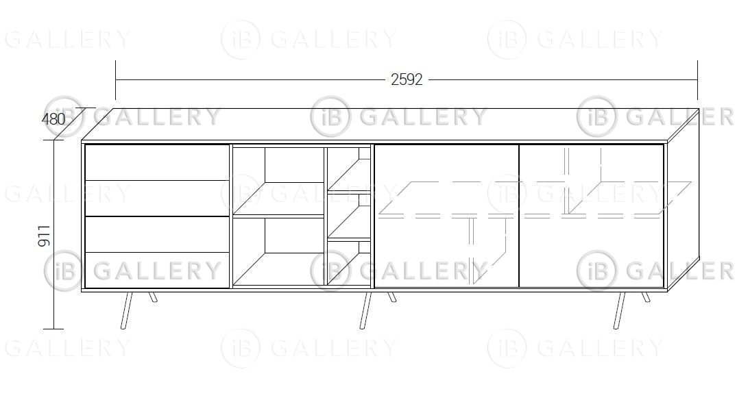 Оригинальный комод, оснащенный открытыми полками, двумя распашными дверцами и 4-мя ящиками.