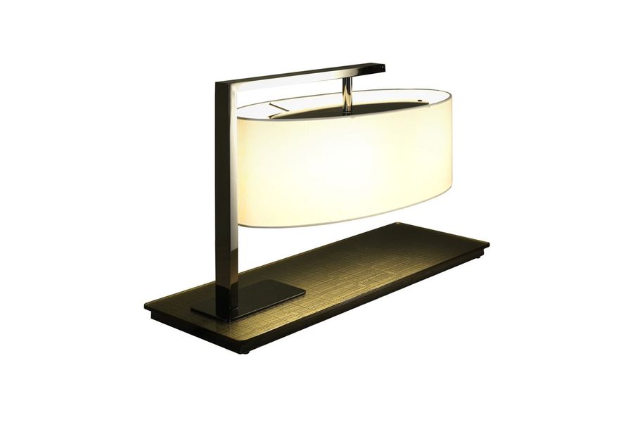 Основание сделано из черного никеля с бронзовыми элементами. Абажур представлен в белом цвете.