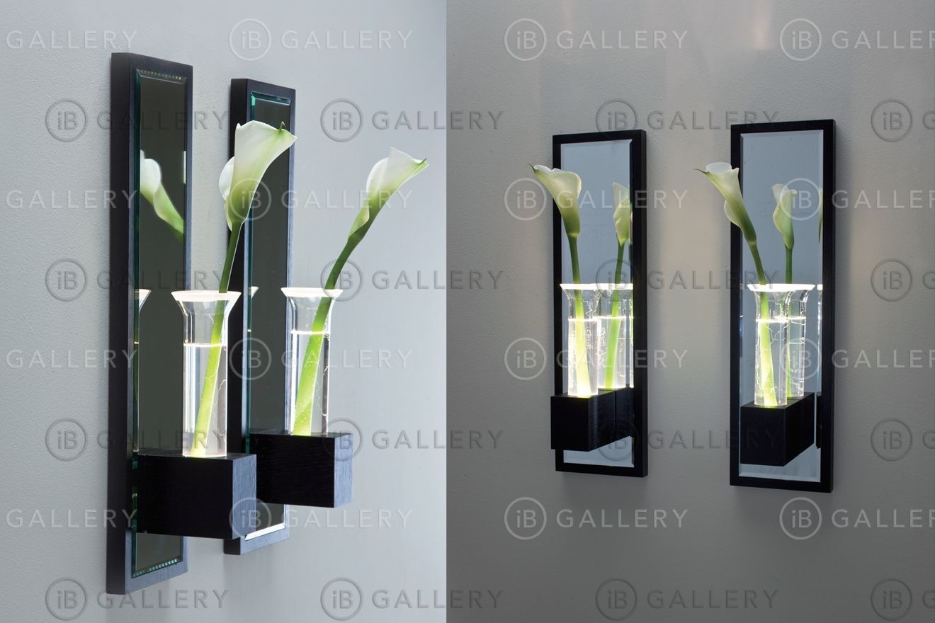 Рама сделана из дерева. Передняя панель из зеркала. Ваза сделана из прозрачного стекла и оснащена подсветкой.