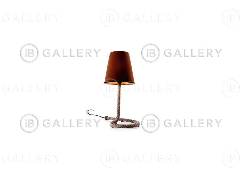 Абажур выполнен из ткани, доступно несколько отделок. Основание сделано из лакированного дерева и кожи.