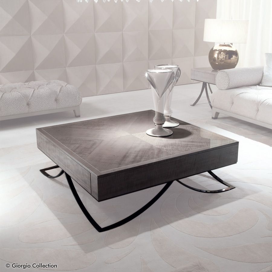 Квадратный журнальный столик облицован шпоном из платана тигрового рисунка с эффектом солнечных лучей и с глянцевым полиэфирным покрытием.