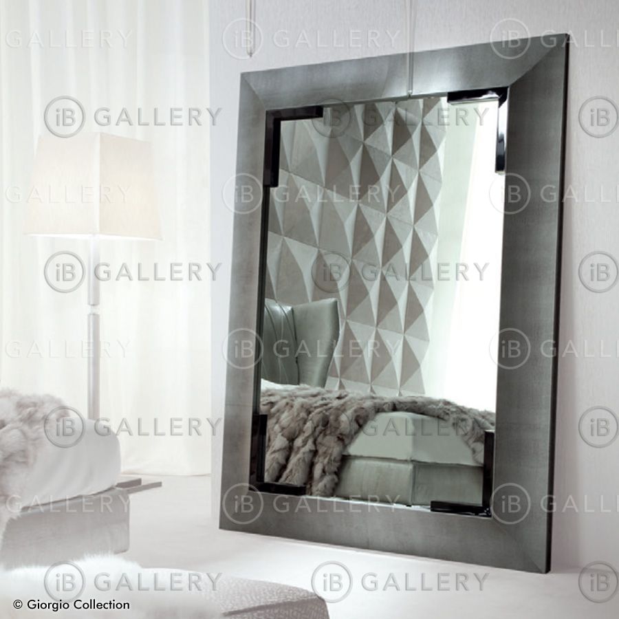 Напольное зеркало в раме, обитой натуральной кожей серебристого цвета с принтом «под игуану».