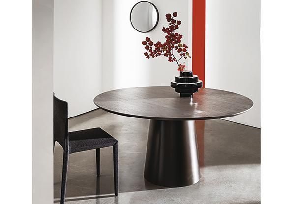 Обеденный стол с основанием из матовой нержавеющей стали или лакированного металла.