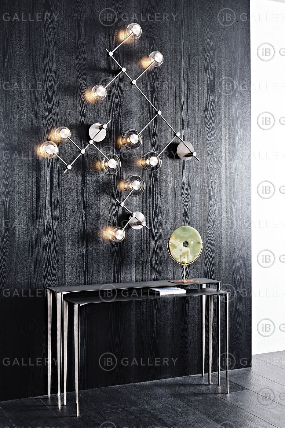 Рама сделана из лакированной стали. Абажуры сделаны из прозрачного стекла, большой абажур из дымчатого стекла.