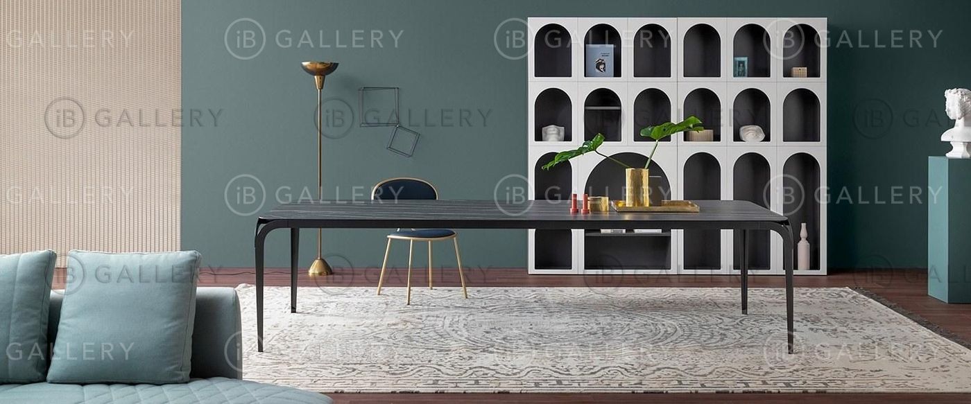 - Обеденный стол на металлических ножках, со столешницей из керамики, дерева или металла