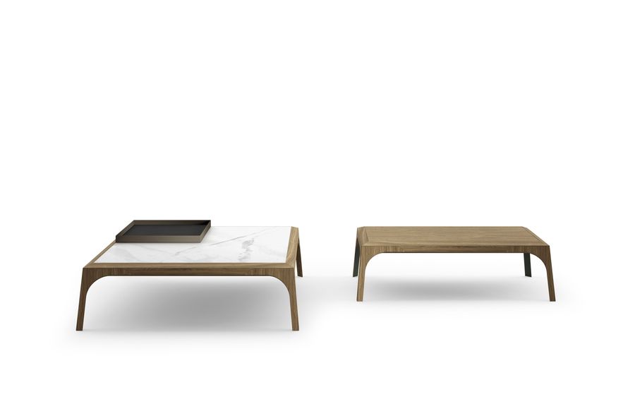 База из дерева дуба и ореха каналетто, столешница из стекла, керамики, зеркала или кожи дополнительная опция для квадратного стола фиксированный металлический «поднос» из металлической рамы толщиной 3 мм и основания на выбор из материалов столешницы.