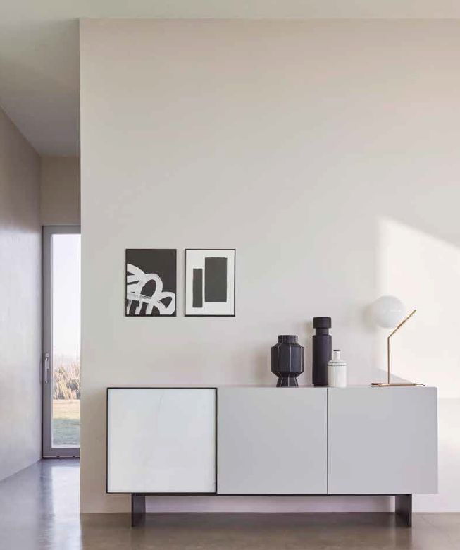 Фасады с лакированной металлической рамой толщиной 3 мм и настраиваемым внутренним оснащением панелью из лака, дерева, стекла, камня или керамики.