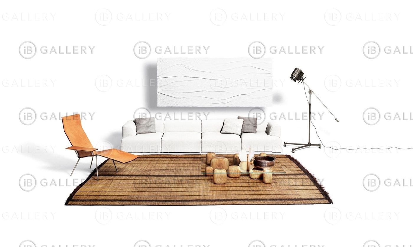 Рама: древесина с эластичными ремнями. Ноги: термопластиковый материал. Прокладка: полиуретан переменной плотности. Полностью съемная обивка в ткани или несъемная в коже. Набивка подушек из гусиного пуха.
