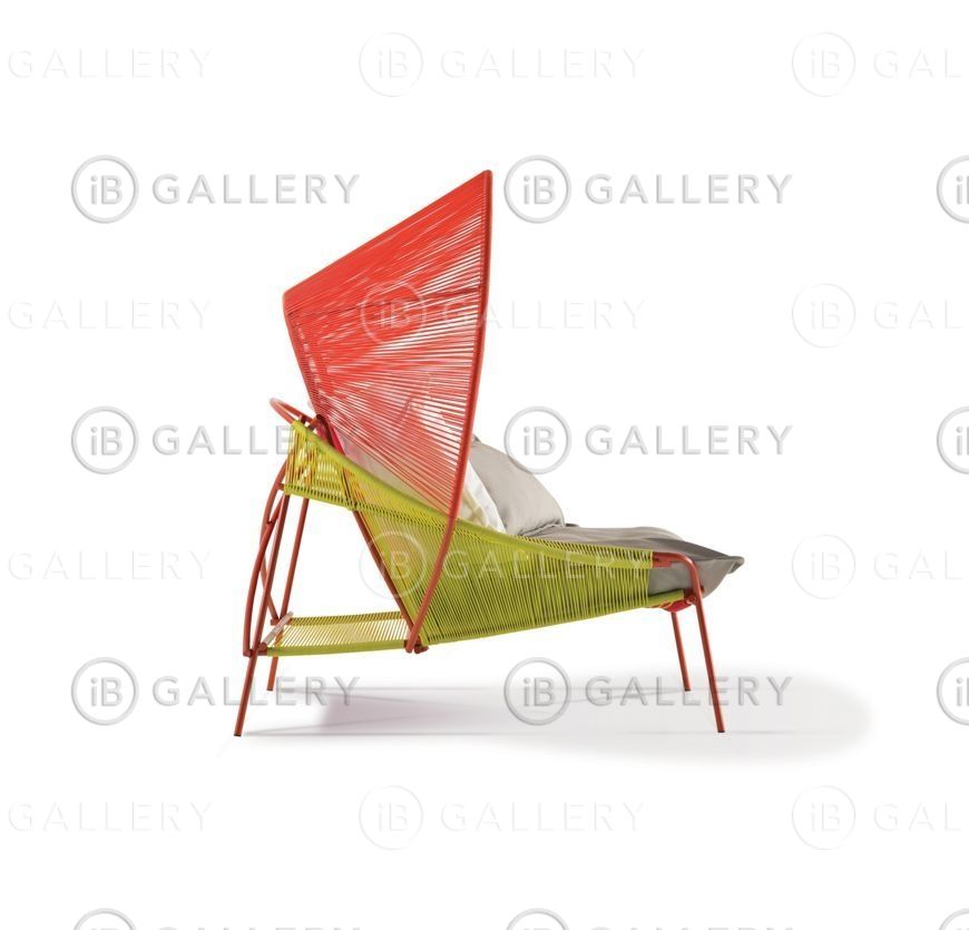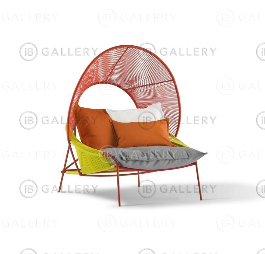 Каркас кресла для открытого воздуха напоминает дом паучка, оплетенный разноцветной паутиной