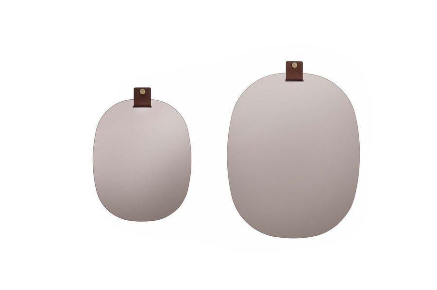 Зеркало подвешивается на кожаный ремешок. Доступно несколько вариантов стекла.