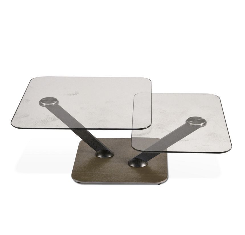Прямоугольные асимметричные столешницы коктейльного столика TIME OUT закреплены на двух ножках покрытых черным жемчужным лаком, встроенных в механизм синхронного вращения.