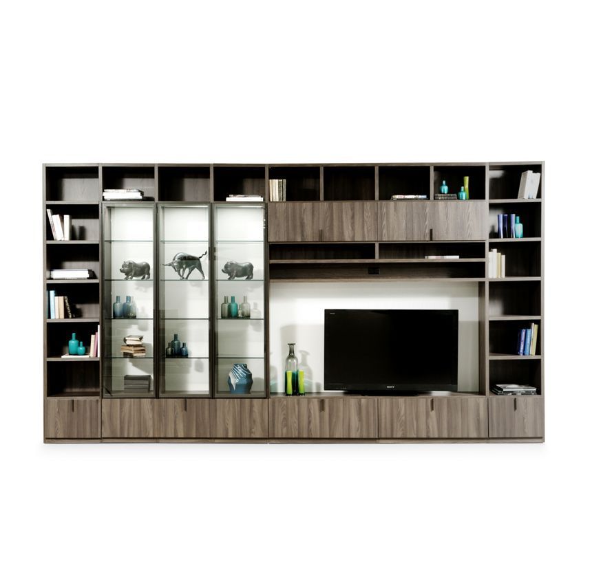 Композиция включает в состав: 6 полок с нишей для телевизора (ширина 178,8 см), полку для аудиосистемы, закрытые модули для хранения с дверцами из окрашенного меламина, 3 витрины с 4 стеклянными полками из прозрачного стекла толщиной 8 мм.