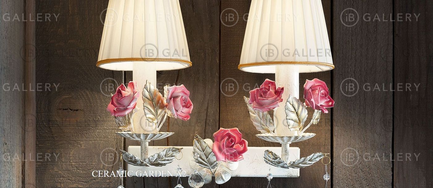 Абажуры сделаны из ткани. Декор представлен в виде цветов.