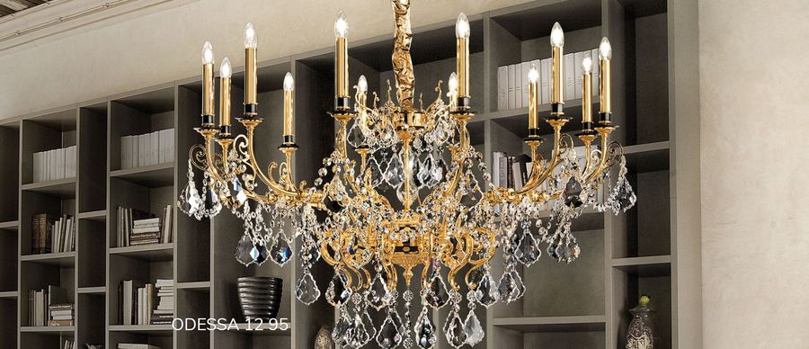 Структура выполнена из металла и латунного литья. Подвески сделаны из прозрачного хрусталя.