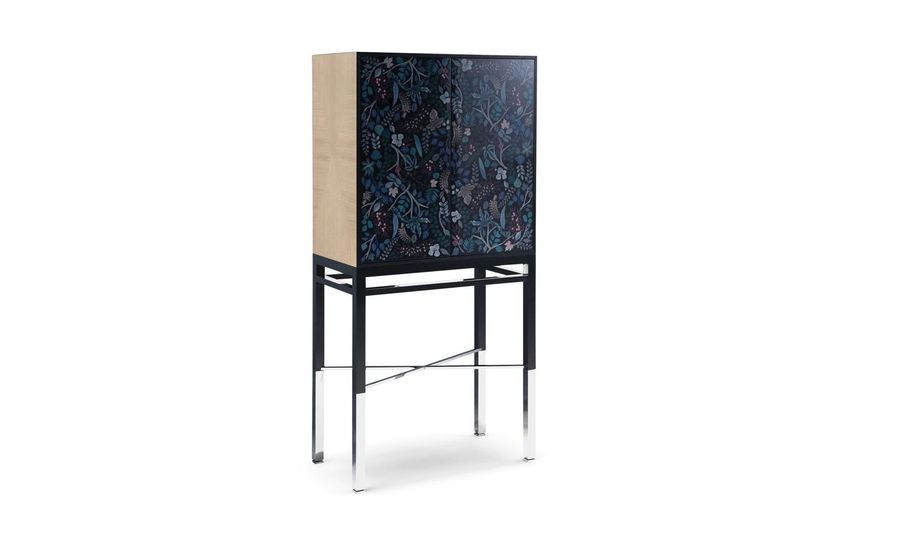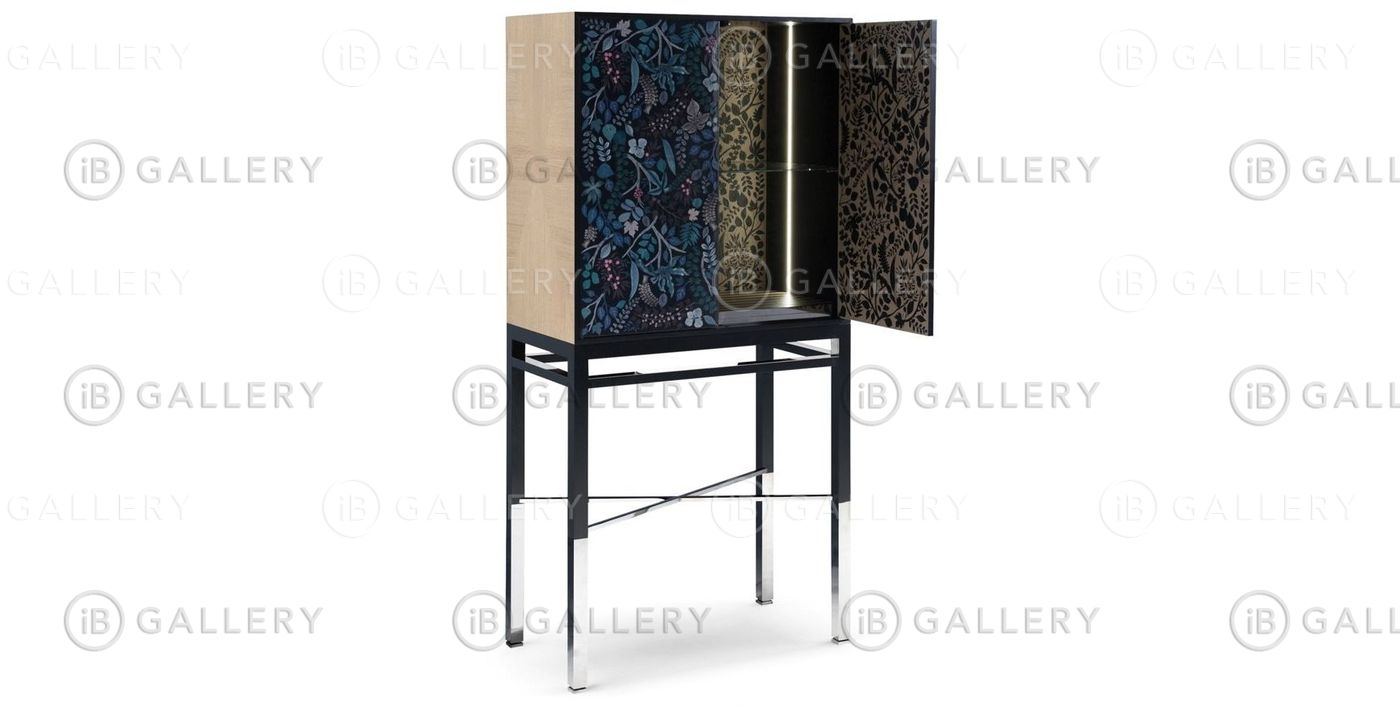 Внутренний фасад дверей из дуба с цифровой печатью Paradis с сенсорной защелкой. Полка сделана из прозрачного стекла. Ножки в черной лакировке. Основание из нержавеющей стали.