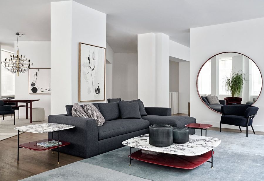 Обивка представлена в коже или ткани. Чехлы из ткани снимаются. Рама сделана из дерева. Сидения и спинка из полиуретана.