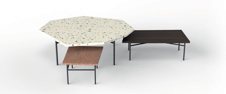 Ножки и рама выполнены из окрашенного металла. Столешница представлена в мраморе в нескольких цветах или в дубе.