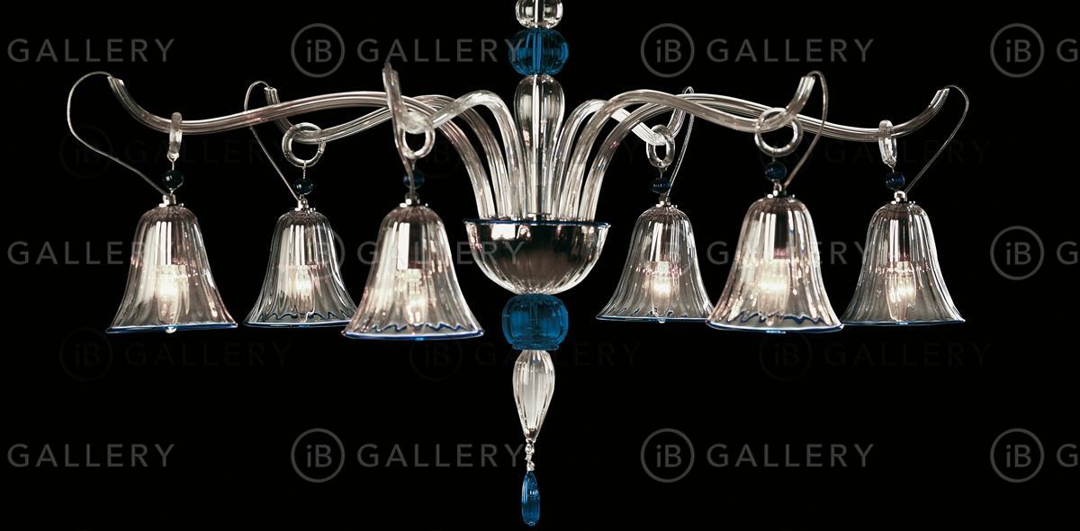 Кристально-прозрачное венецианское стекло, дополненное синими или красными деталями.