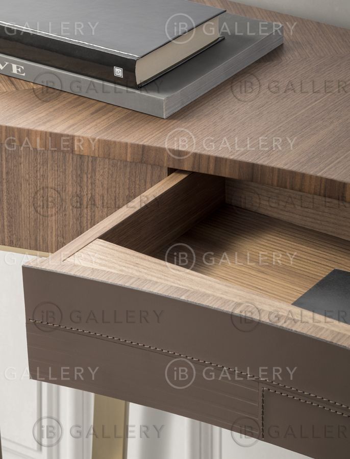 Столешница выполнена из дерева со вставками из кожи. Основание из металла в золотом цвете. Отделка в матовой лакировке.