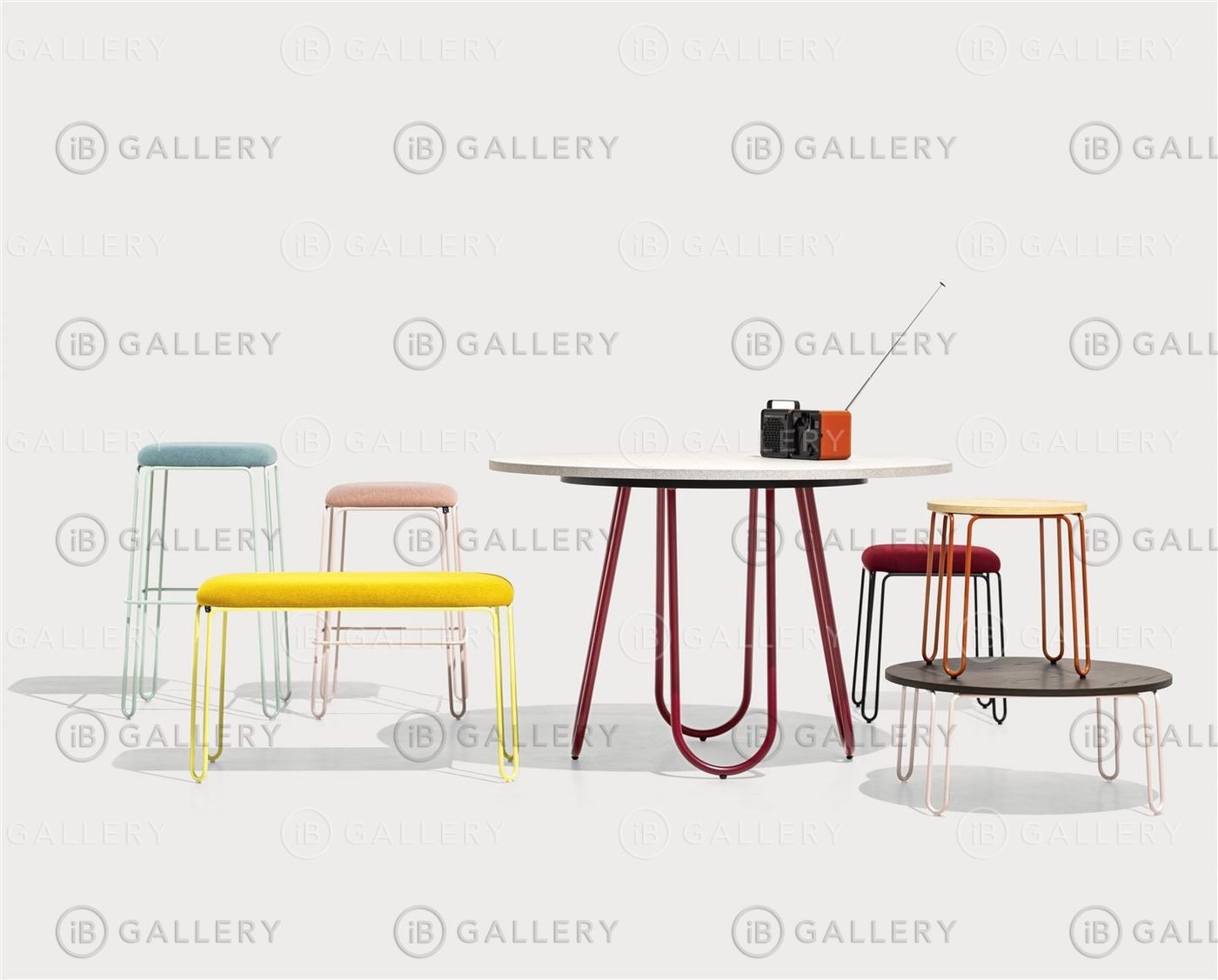 Он оснащен ножками из изогнутого металлического стержня и столешницей из меламинового дерева с прямыми краями.