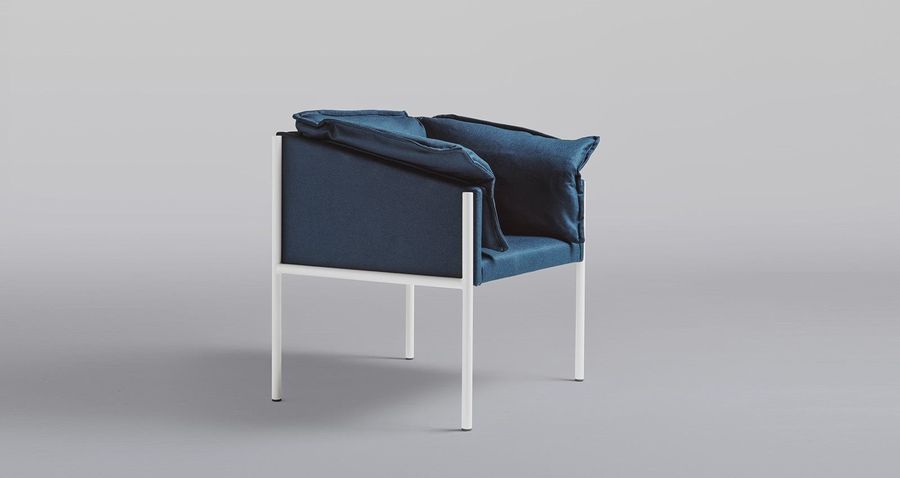 Деревянный каркас покрыт пенополиуретаном и подкладкой из полиэфирного волокна. Подушка спинки и подлокотники в простерилизованных перьях. Подушка сиденья из пенополиуретана и подкладки из полиэфирного волокна. Покрашенные стальные ножки. Тканевый чехол.