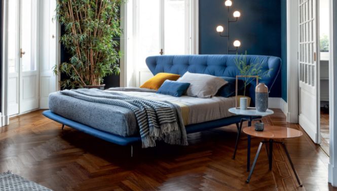 Дизайнерская кровать, оснащенная высоким и мягким изголовьем. Она может быть украшена ромбовидным узором или узором капитоне.