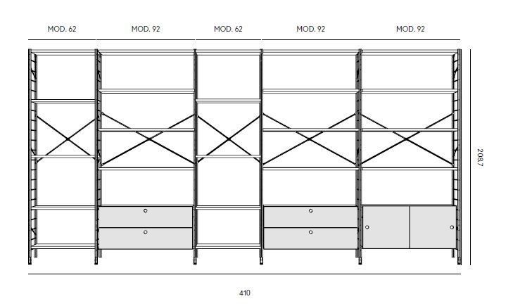 Стойки из окрашенного в белый или черный цвет металла. Полки из белого меламина или ореха с эффектом дерева.