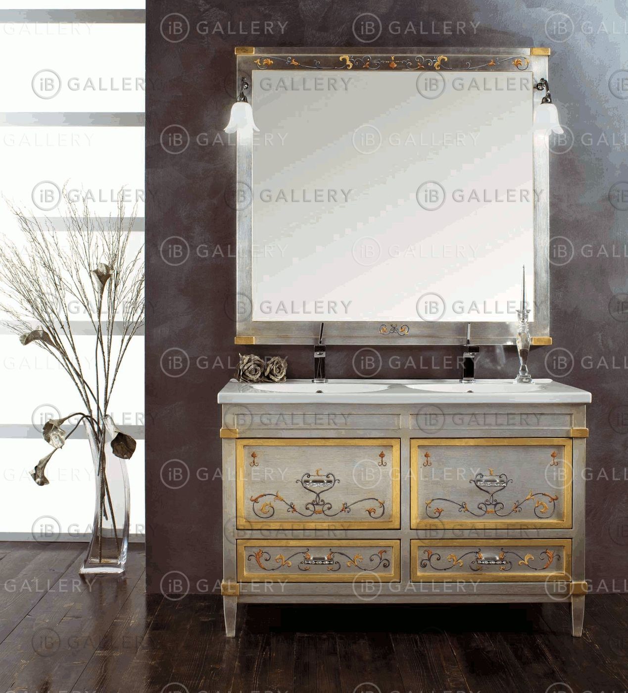 Композиция для ванной комнаты, выполненная с отделкой под металл и ручной росписью.